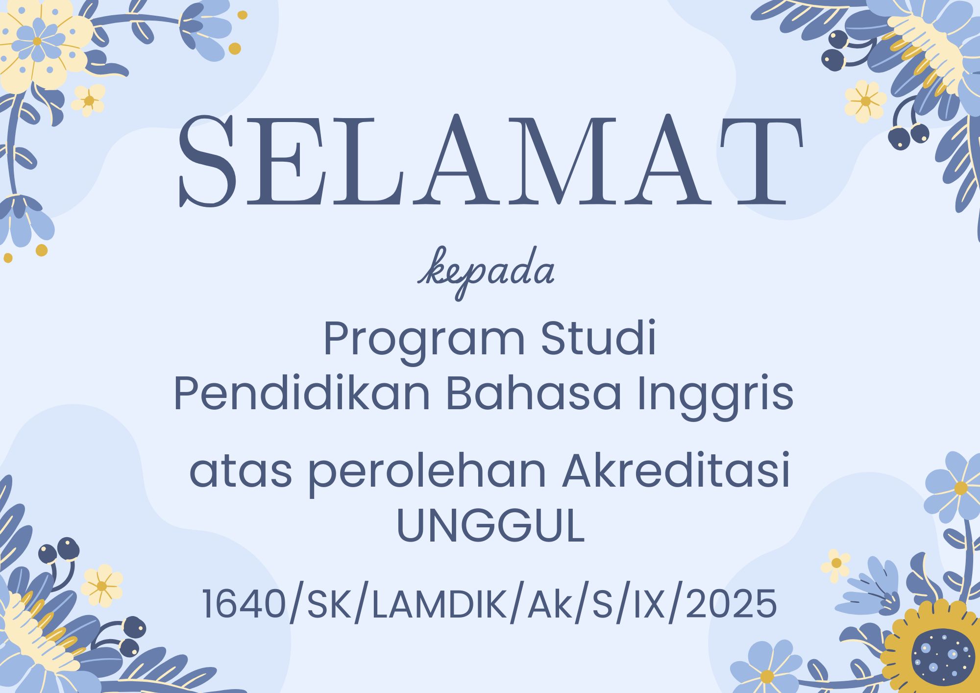 Program Studi Pendidikan Bahasa Inggris berhasil meraih status Akreditasi Unggul dari Lembaga Akreditasi Mandiri Kependidikan (LAMDIK). Status akreditasi tertinggi ini ditetapkan melalui Surat Keputusan LAMDIK Nomor 1640/SK/LAMDIK/Ak/S/IX/2025 tertanggal 22 September 2025, dan dinyatakan berlaku hingga tahun 2030.